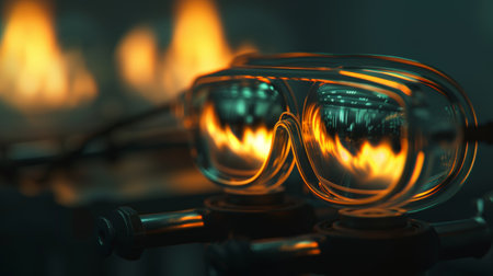 A scientists protective goggles reflecting the glow of a Bunsen burner