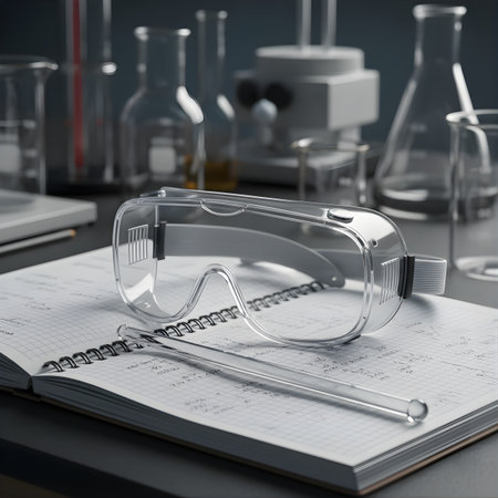 A detailed view of safety goggles and gloves on a lab countertop, surrounded by clear containers, emphasizing essential protective gear for scientific research and experimentation.