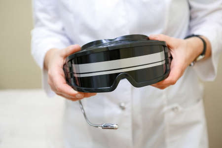 Doctor in lab coat in hands holding black glasses for color-pulse therapy, close-up