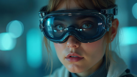 Futuristic woman wearing protective goggles in modern tech environment.