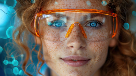 Close-up of a young female physicist with freckles wearing orange safety glasses, reflecting intricate equipment in a blue-tinged lab. physicist