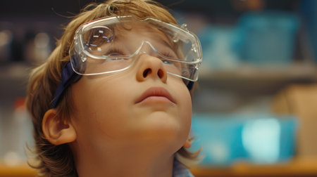Close up of happy student face looking up while wearing safety glasses. Portrait of young children making experiment or studying in science lesson with blurring background. Creative education. AIG42.