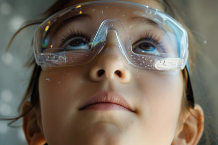 Close-up portrait of a focused young scientist girl wearing safety glasses, conducting an experiment in a professional laboratory setting, showcasing her dedication to scientific exploration