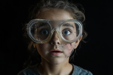 Little Brazilian girl, her face covered with soot and surprise behind large lab glasses, set against a deep black background, creating a stark contrast.