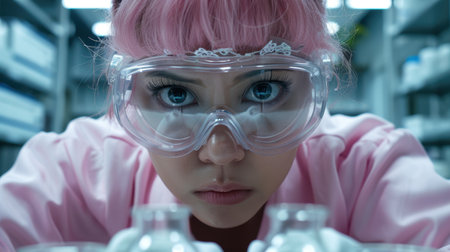 young woman in pink lab coat and protective goggles