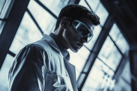 One person, a scientist, wearing protective eyewear and gloves, focuses generated by artificial intelligence