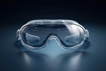 Clear protective goggles are positioned on a sleek surface, highlighting their design with captivating lighting.