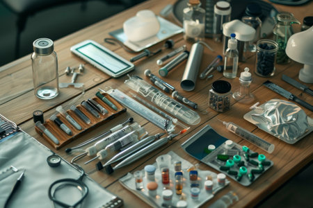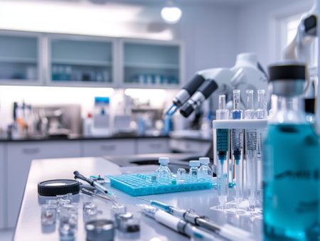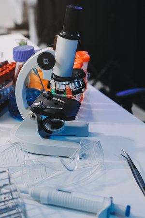 Laboratory environment with chemical tubes and pharmaceutical tools. Ideal for biochemistry research technology visuals.