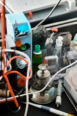 various equipment for testing and reparation of electronic devices in workshop, small business