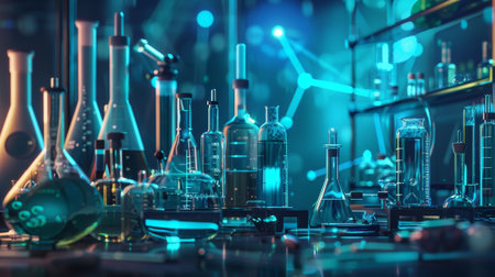 A scientific laboratory composition featuring beakers and flasks filled with blue liquid, placed on a metallic surface under futuristic lighting.
