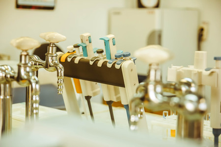 Laboratory pipettes on blurred laboratory background, research and development concept with free space for text.