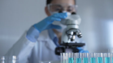 Laboratory tubes, filled with a blue liquid, are in focus, closeup view. Female scientist researcher is using a microscope at the background. Medicine and science concept