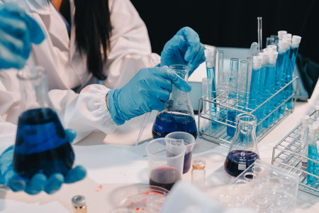 Laboratory assistants are investigating chemical reactions, medical scientists, chemical researchers, chemical experiments and disease testing from patient blood samples. Medicine and research concept
