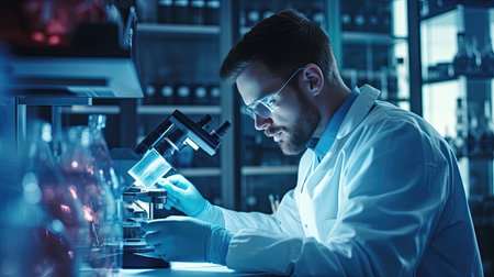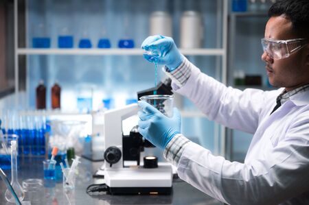 Biochemistry laboratory research, Chemist is analyzing sample in laboratory with Microscope equipment and science experiments glassware containing chemical liquid