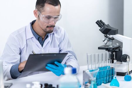 Chemist taking notes on research data, Scientist is working in the laboratory, Chemist is analyzing experimental results and taking notes in the laboratory, lab idea.