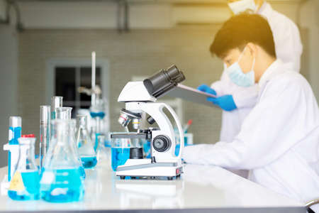 Two young men scientist using a microscope for looking solution in corona virus Laboratory in a chemical laboratory room.