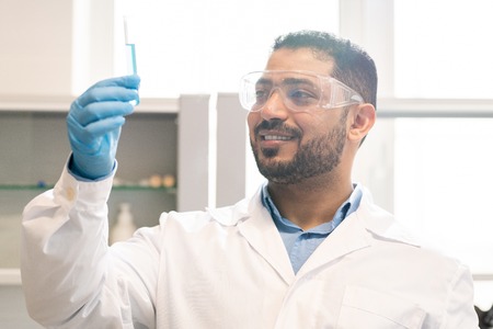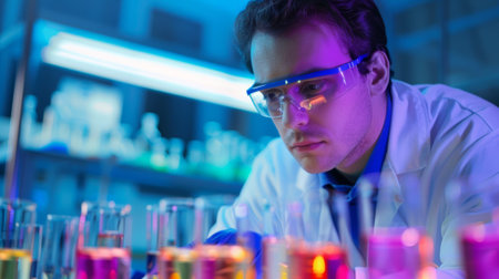 Male scientist in lab studying vaccine development and chemical reactions using test tubes