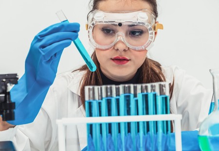 Working in laboratory. Young woman working in chemical laboratory studying blue chemical agent