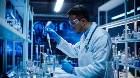 Leaning technician concentrating on task at lab bench, with goggles, lab coat and glove, copy space. Science, laboratory, research, innovation, experimental, technology, professional