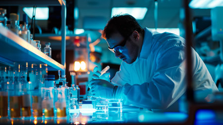 A western scientist man working on test tube to analysis and develop vaccine of covid-19 virus in lab or laboratory in technology medical, chemistry, healthcare, research. Experimental science.