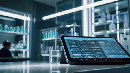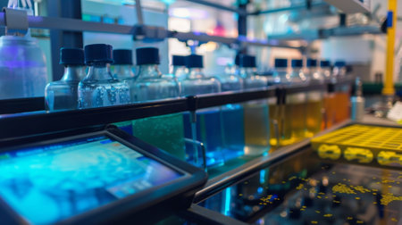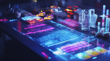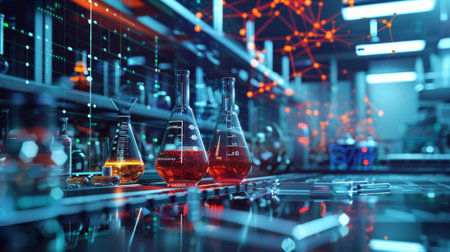 Flasks and beakers containing chemical compounds in modern laboratory setting with futuristic interface