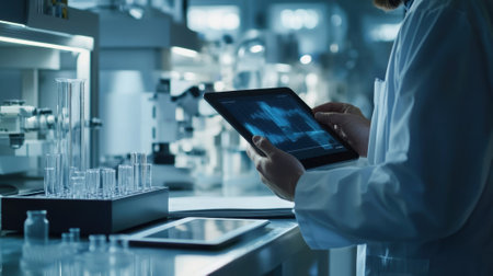 Close up of scientist in lab coat working holding tablet standing in modern equipped laboratory. Team chemists examining vaccine evolution using high tech and chemistry tools for virus development