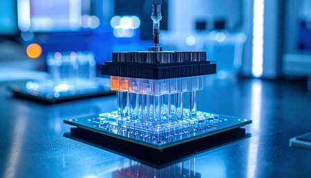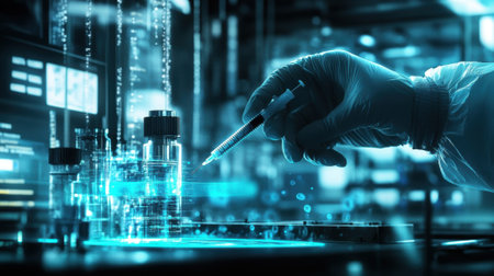 Laboratory scene showcasing a scientist manipulating a microfluidic chip amidst glowing interfaces displaying real-time data. the environment reflects cutting-edge technology and precision in advanced scientific research and analysis.