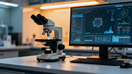 Scientist uses microscope to analyze samples with vibrant digital data displayed on screen. Modern laboratory setting with clean surfaces and advanced equipment.