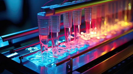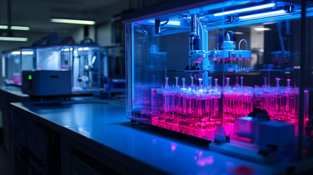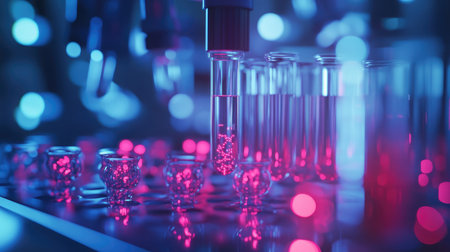 A stunning laboratory scene featuring illuminated test tubes and beakers under vibrant blue and pink lights, showcasing a blend of science and aesthetic appeal.