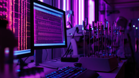 A focused shot of pipettes and beakers on a cluttered table with a highresolution computer screen showing detailed cellular structures and analysis software running..