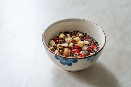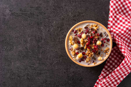 Traditional Turkish Noah's pudding in bowl on black slate background