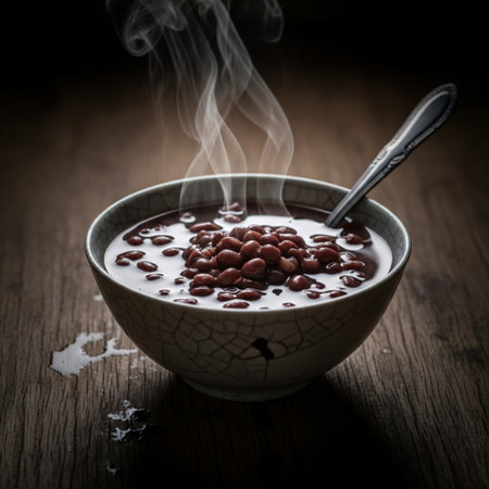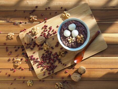 Bowl of red bean soup with smoke on wooden background. Toned.