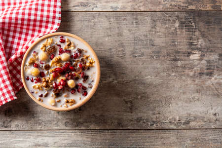 Traditional Turkish Noah's pudding in bowl on wooden table