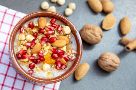 Oatmeal with nuts and pomegranate seeds in a ceramic bowl on a gray background
