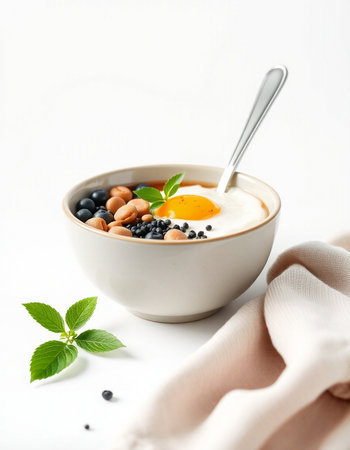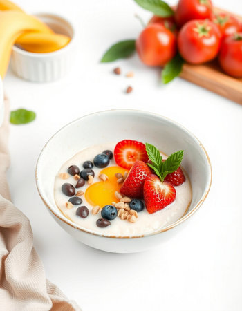 Healthy breakfast bowl with oatmeal, berries, eggs on white background