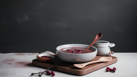 Homemade berry soup with cranberries in a bowl on a wooden board