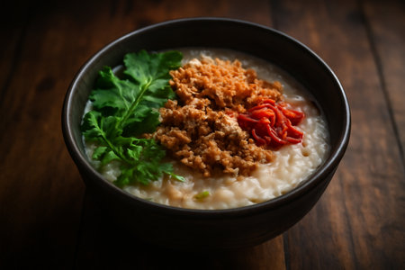 AI generated rustic Thai rice porridge with crispy pork served in a dark earthenware bowl. The dish features vibrant fresh ingredients on a wooden table with moody lighting.