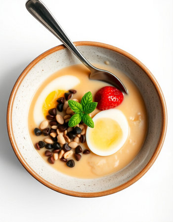 A delightful bowl of creamy rice pudding topped with a heart-shaped red jam. Surrounding red beans add color to this vibrant and sweet dish. Perfect for romantic occasions or special breakfasts.