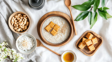 A visually appealing arrangement featuring rice porridge topped with crispy tofu and sesame, complemented by nuts and honey, perfect for a healthy breakfast.