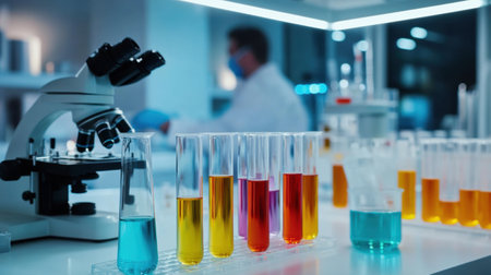 Brightly colored test tubes line the table, while a researcher in a lab coat observes samples through a microscope in a modern laboratory.