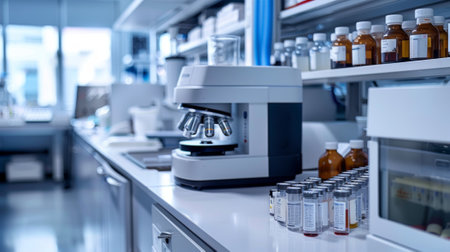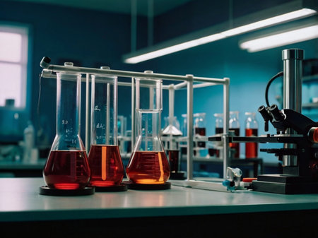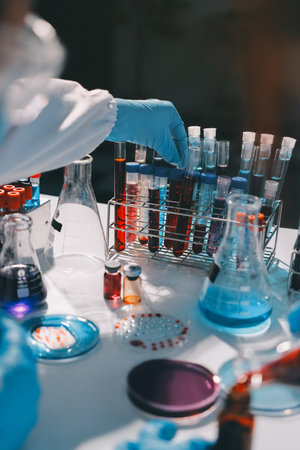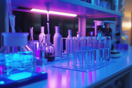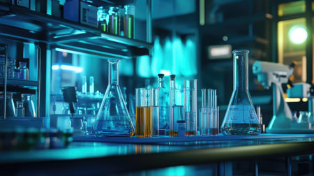 Laboratory environment with chemical tubes and pharmaceutical tools. Ideal for biochemistry research technology visuals.