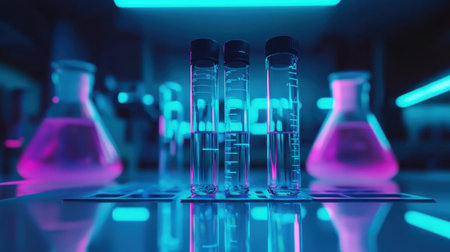 A stunning laboratory scene featuring illuminated test tubes and beakers under vibrant blue and pink lights, showcasing a blend of science and aesthetic appeal.
