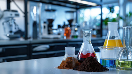 This image captures a modern laboratory setting featuring colorful liquids in glassware and various powders on a clean work surface.
