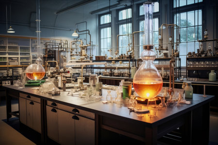 Modern scientific chemical medical research laboratory with equipment and flasks for conducting research and testing experiments.