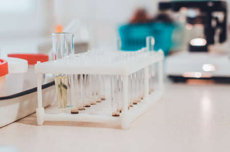 hitech biochemistry laboratory equipment details closeup with test tube for biological experiments in laboratory