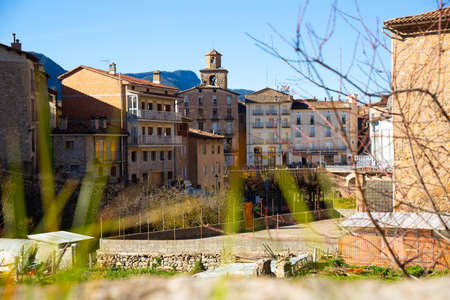 street with river and residential buildings in La Pobla de Lillet in Spain