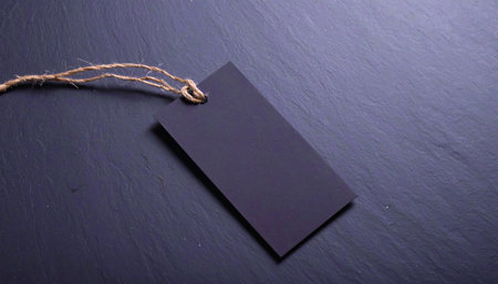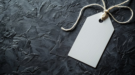 Realistic single matte black blank price tag with brown twine loop, placed flat on dark black slate stone background, soft top light, minimal premium concept,