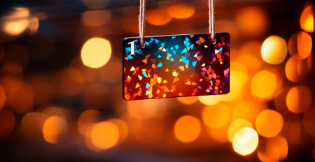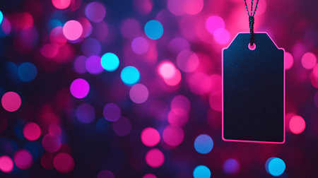 Blank tag on black background with bokeh lights and flowers