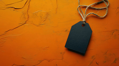 Close-up of black price tag with twine string, contrasting against a bold orange background in minimalist retail style