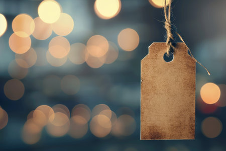 A plain tag is suspended by twine against a backdrop of gently glowing lights, creating a warm, inviting atmosphere during the evening.